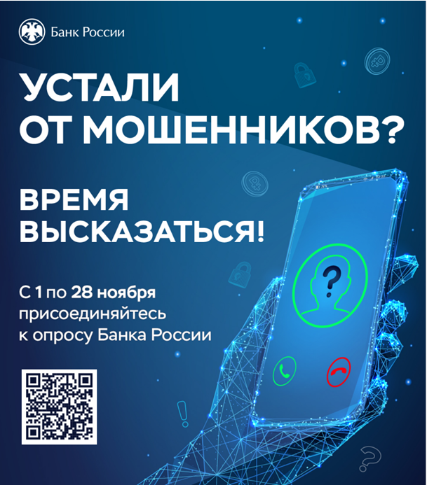 Банк России до 28 ноября 2025 года проводит опрос «Степень удовлетворенности населения уровнем безопасности финансовых услуг, оказываемых организациями кредитно-финансовой сферы». Опрос осуществляется в электронной форме путем заполнения анонимной анкеты, включающей в себя несколько простых вопросов. Анкета размещена на официальном сайте Банка России в сети Интернет, доступна для заполнения любому физическому и юридическому лицу по указанному QR-коду.